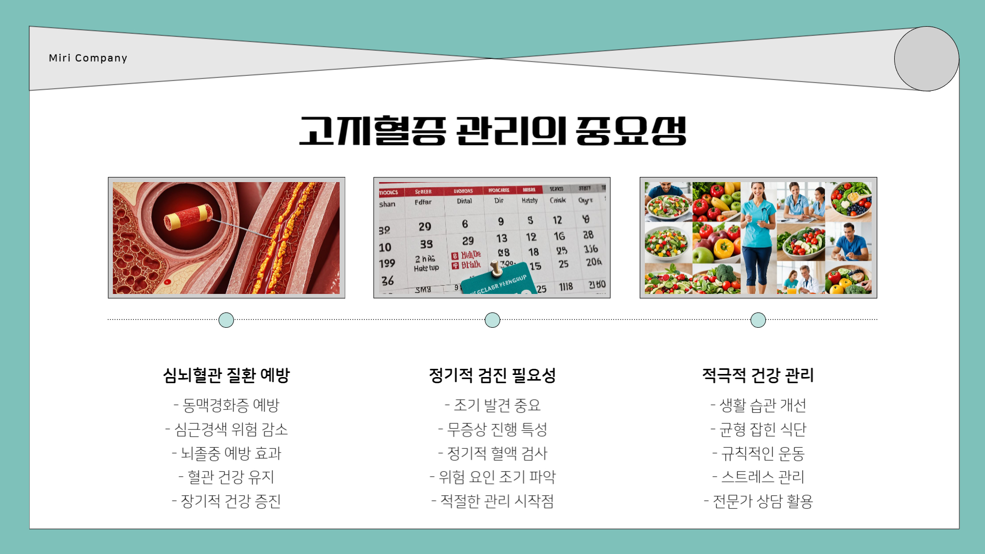 특별한 증상이 없더라도 정기적인 고지혈증 검사를 통해 자신의 상태를 점검하고, 필요한 경우 전문가와 상담하여 적극적으로 관리하는 습관을 통해 심뇌혈관 질환의 위험으로부터 소중한 건강을 지키시길 바랍니다.