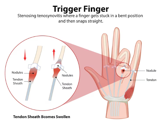 방아쇠 수지 (방아쇠수지증후군) | 손가락을 구부릴 때 '딱' 소리와 함께 통증, 움직임 제한 가능 | 손가락 힘줄에 염증 발생, 주로 엄지, 중지, 약지에 발생 |
